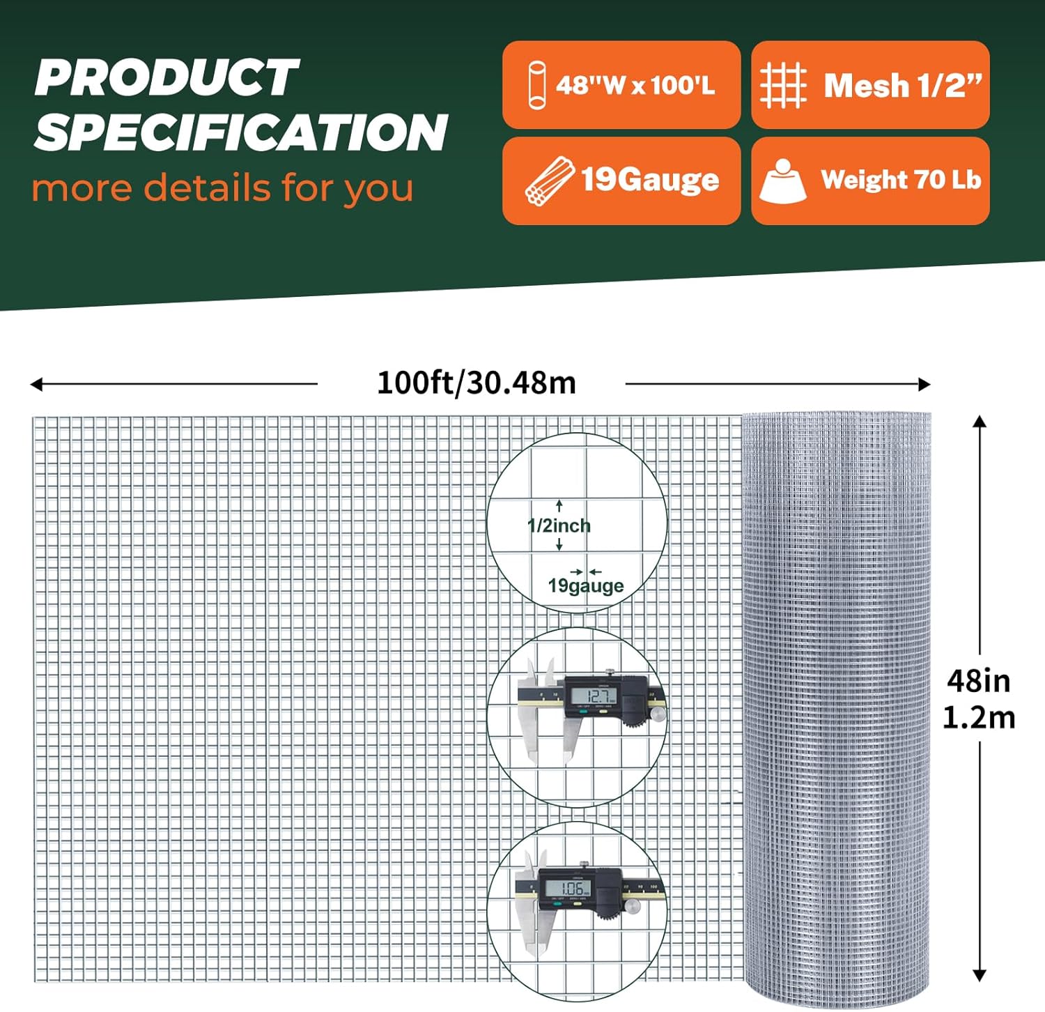 - Product Size: This product is 19ga 1/2'' 48''×100'. Please purchase the appropriate width and grid according to your needs to avoid delaying your use.