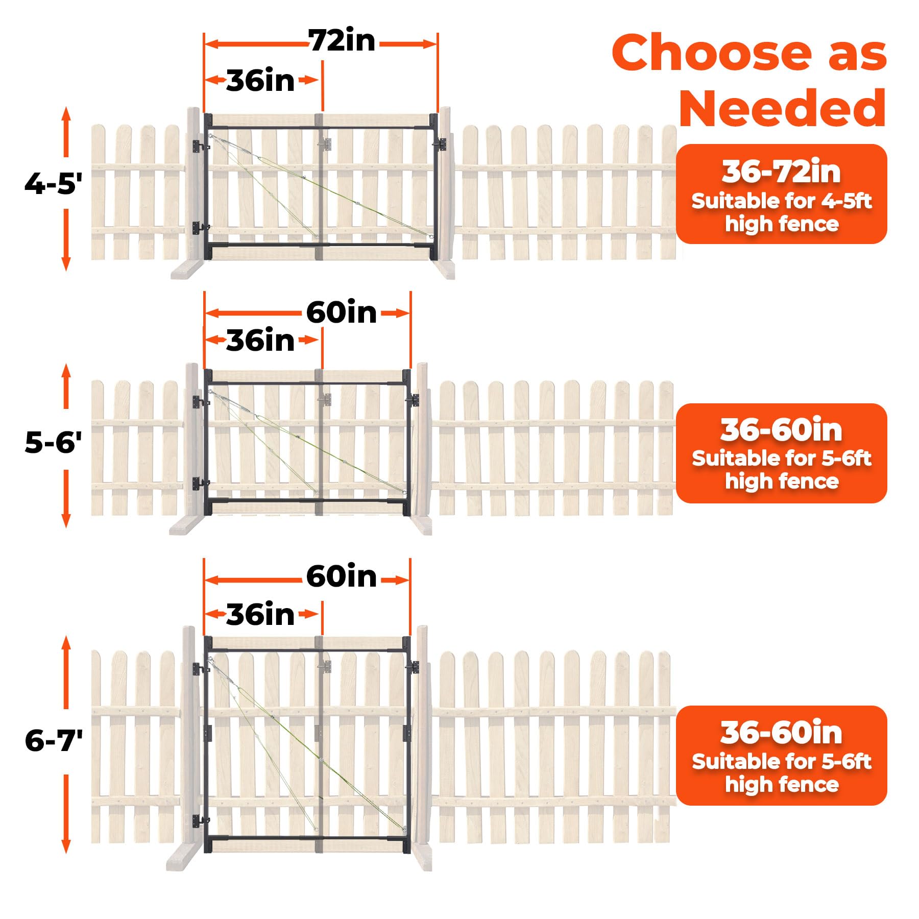 Heavy Duty DIY Fence Gate Kit – 36"-72" Adjustable Wood Gate Building Kit for 4-5 ft Fences, Anti-Sag Steel Frame with UV-Resistant Coating, Fits Both 1"x4" and 2"x4" Wood